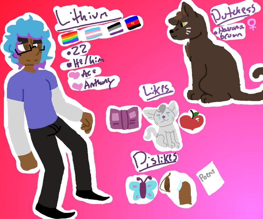 He has a Havana brown named Duchess, she was a rescue and an apology gift from Arthur. Before getting Dutchess from Arthur, Lithium had been no-contact with him too, as he used to be Leith's boyfriend, but they started talking again after Arthur broke up with him.