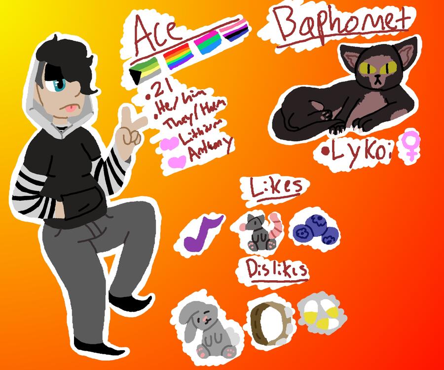 Ace is married to Lithium and dating Anthony. Ace met Lithium in their highschool's debate club, and they just kept talking afterwards, fast forward a couple years, and they're happily married. Ace adores Lithium, but they weren't sure about Anthony. When Lithium told Ace that he was poly, Ace was scared for a moment that they weren't good enough for Lithium, which was something they'd been worrying about for a while. Ace wasn't sure about it even after a very long explanation from Lithium, but gave in and said they could try it. Admittedly, once they started dating Anthony, they warmed up to the idea a bit, Ace really liked how nice Anthony was. Ace probably wouldn't have dated Anthony on their own, but they do like Anthony a lot, and they're happy they agreed to the arrangement.