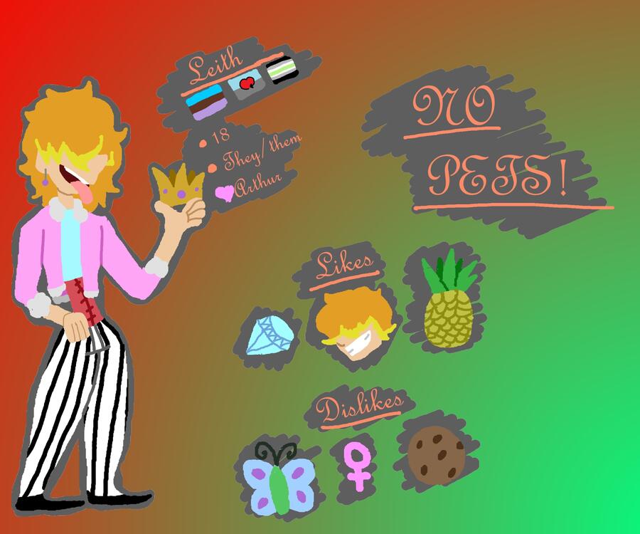 Leith used to date Arthur, before Arthur broke up with him he liked to randomly break up with Arthur, it satisfied him to no end seeing Arthur's devotion to him and it pleased him to see that Arthur would always be willing to come back to him. After the two broke up, Leith wasn't too upset, until Arthur refused to give him his bird back. That bird had been his favourite toy, and he wasn't ready to lose it yet.